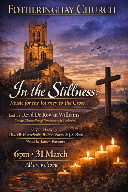 In the Stillness: Music for the Journey to the Cross - led by the Revd Dr Rowan Williams, Canon Chancellor at Peterborough Cathedral, with music provided by James Parsons, organist at Fotheringhay. Music by Diderik Buxtehude, Charles Hubert Parry and JS Bach