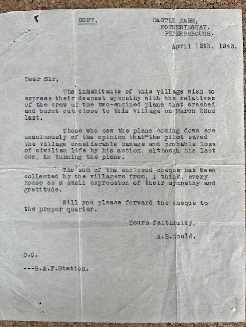 A letter from Mr Alec Biffen Gould, Castle Farm, Fotheringhay, dated 12 April 1943, reveals the sympathy of the village towards the relatives of the crew and the gratitude to the pilot in averting a greater tragedy.