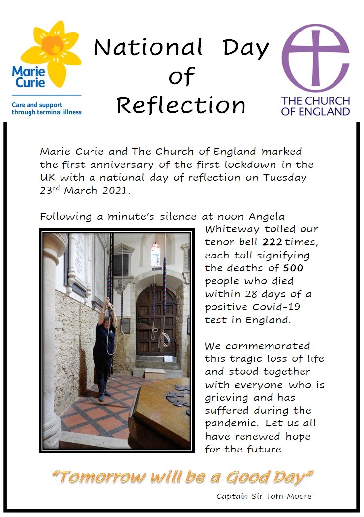 We are grateful to Nick Elks for muffling the bell and to Angela Whiteway for tolling slowly for a whole hour so that we could participate fully in this moving tribute to HRH Prince Philip.