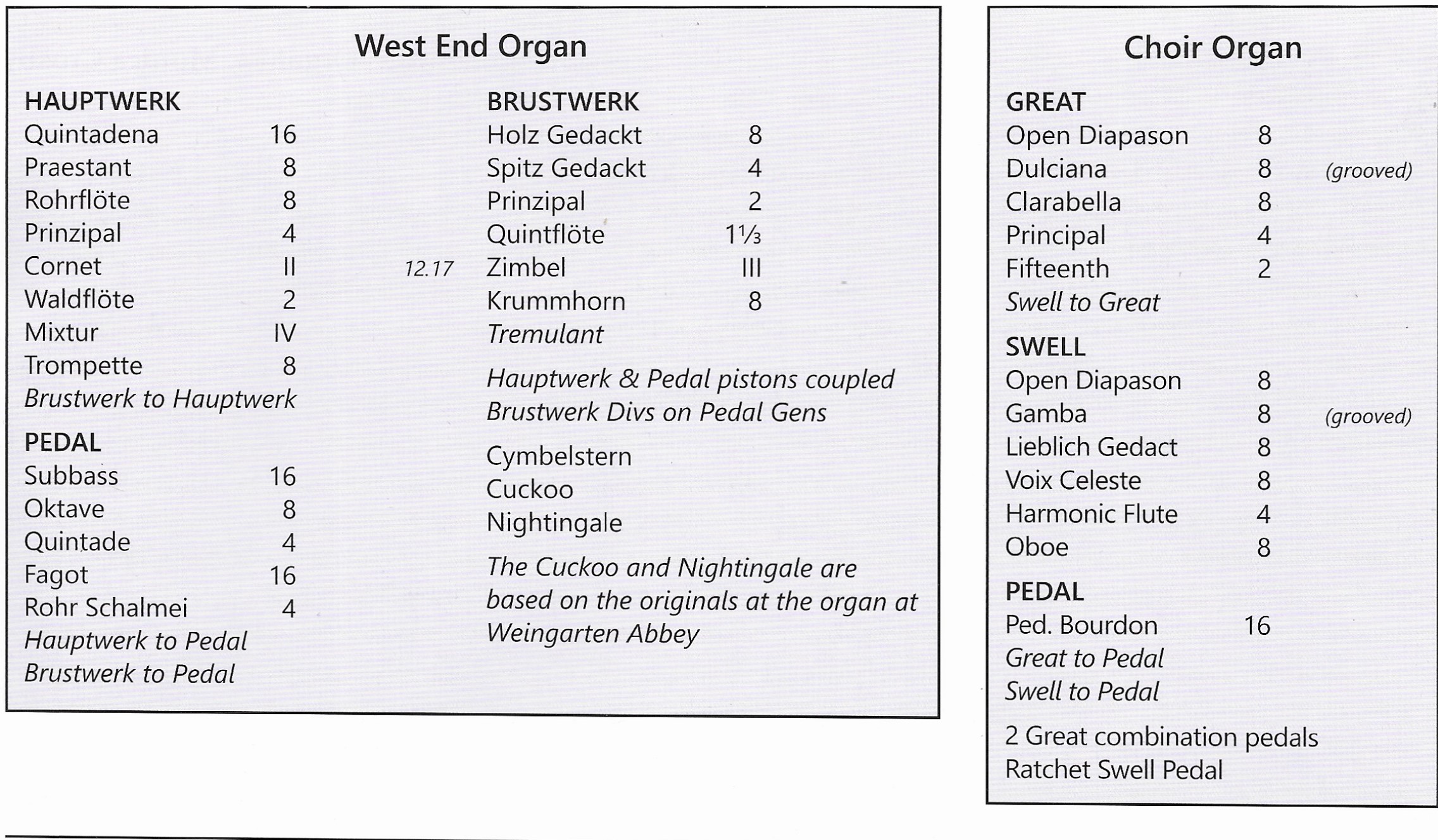 The west end organ was originally installed in 1977 by Grant, Degens and Bradbeer in the Chapel of Cranleigh School, Surrey. It was moved to Warmington in 2010.