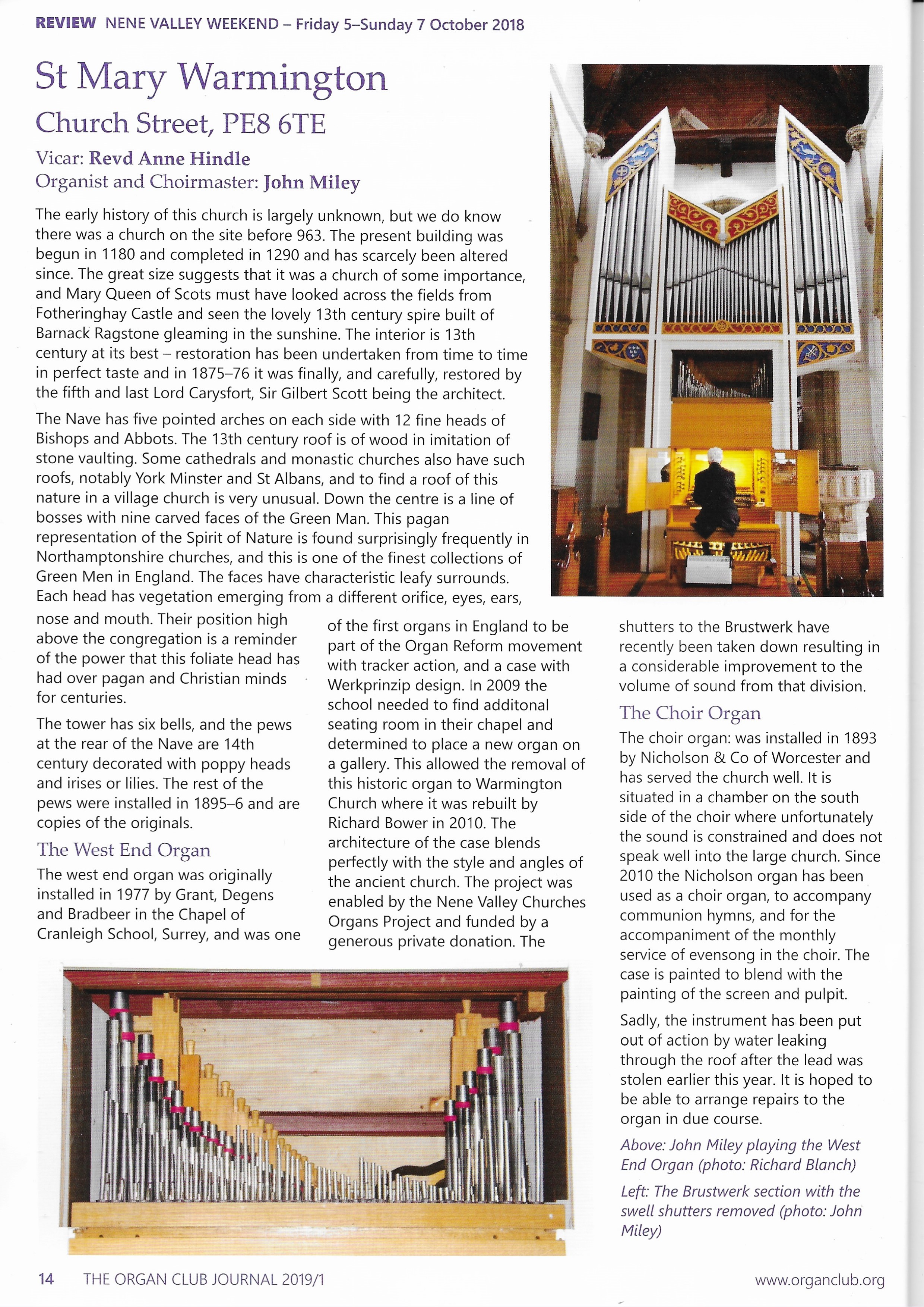 Article about the two organ at Warmington, from The Organ Club Journal, 2019/1: